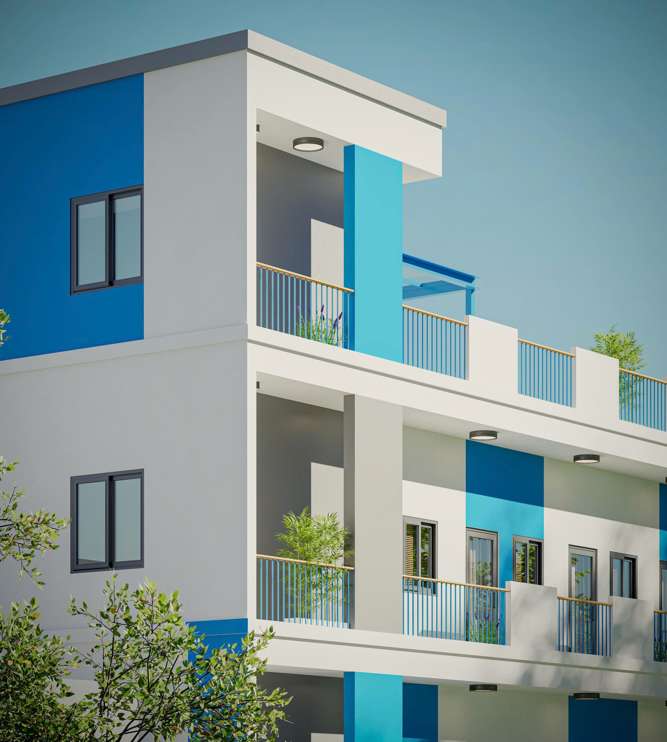 Mặt đứng sử dụng nhịp điệu hình khối rõ ràng, kết hợp ban công và hệ cửa sổ hợp lý giúp: