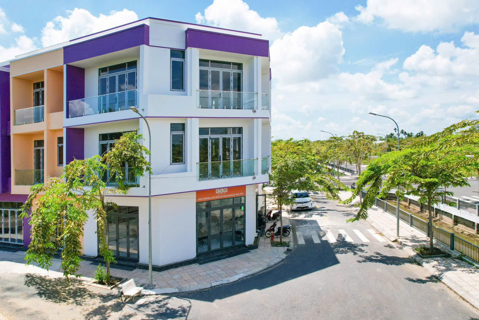 Dãy shophouse được thiết kế theo phong cách hiện đại, hình khối rõ ràng, màu sắc nổi bật nhưng hài hòa tổng thể, tạo nên diện mạo đô thị năng động và thu hút.