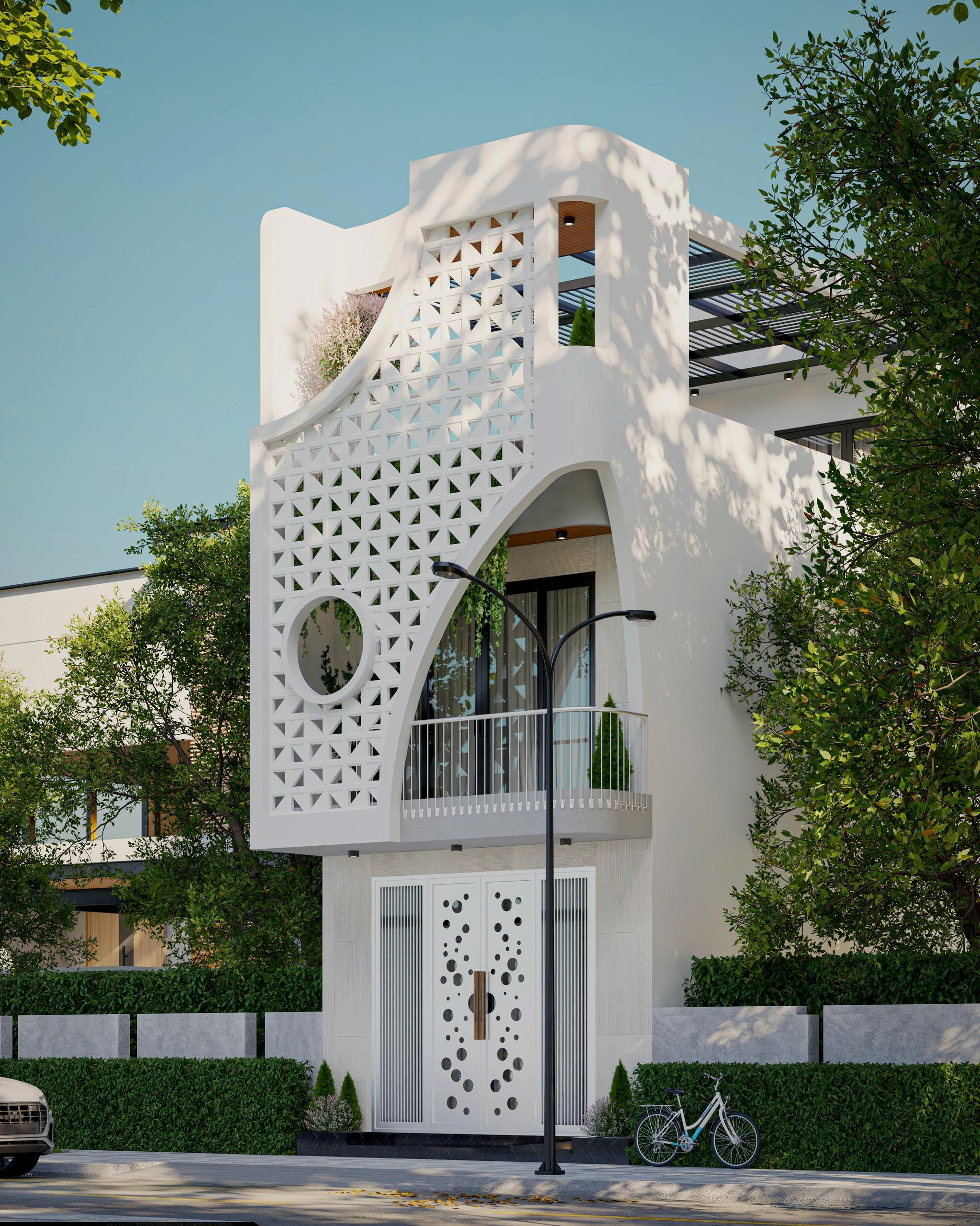 Các đường cong được xử lý tinh tế giúp mặt đứng công trình trở nên nhẹ nhàng, hiện đại nhưng vẫn có chiều sâu kiến trúc.